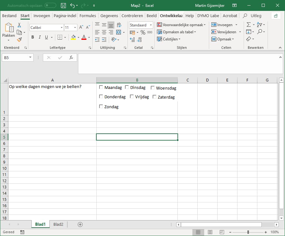 Naast uitklapmenu’s zijn selectievakjes ook handige elementen om toe te voegen in een Excel-document. Waar je uitklapmenu’s kunt gebruiken om mensen te laten kiezen tussen bepaalde vaste waarden, kun je selectievakjes gebruiken om mensen bepaalde zaken aan te laten vinken. Stel bijvoorbeeld dat je een formulier maakt en wilt weten op welke dagen je iemand eventueel mag bellen. Het antwoord kan meer dan één dag zijn, in welk geval een uitklapmenu geen optie is, maar selectievakjes wel. Voordat je een selectievakje kunt toevoegen, moet je eerst de ontwikkelmodus inschakelen. Klik op Start / Opties en vervolgens op Lint aanpassen. Plaats nu in het rechterdeelvenster een vinkje bij Ontwikkelaars. In het lint komt er nu een optie Ontwikkelaars bij. Klik hierop en vervolgens op Invoegen / Selectievakje. Er wordt nu een selectievakje ingevoegd (dat je zo vaak kunt kopiëren als je wilt). Schakel de Ontwerpmodus uit om het vakje ook daadwerkelijk te kunnen gebruiken.