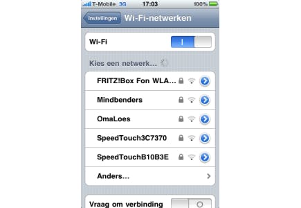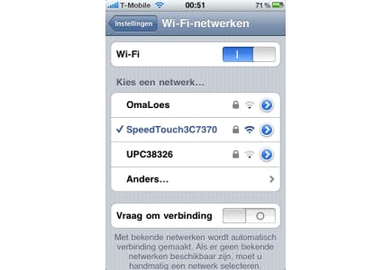 Onderaan in het scherm met de beschikbare netwerken ziet u de optie Vraag om verbinding. Als u deze optie inschakelt, krijgt u iedere keer als u buiten bereik van uw netwerk bent een schermpje in beeld met de vraag met welk netwerk u verbinding wilt maken. Dit kan op den duur gaan irriteren, zeker als u bijvoorbeeld alleen even naar buiten gaat om de post te halen. Als u deze optie uitschakelt, blijft u verschoond van deze meldingen. Uw iPhone zal overigens altijd automatisch verbinden met uw eigen netwerk, als u maar binnen bereik van dat netwerk bent.
