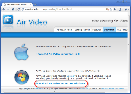 We hebben nu laten zien hoe u met uw iPhone muziek en andere media kunt bedienen die op uw pc staat. Maar het wordt nog mooier. U kunt namelijk ook video's die op uw pc staan bekijken op uw iPhone, ongeacht in welk formaat ze zijn opgeslagen. U hebt hier weer twee onderdelen voor nodig: een programma voor uw pc en een app voor uw iPhone. Allereerst gaat u naar www.inmethod.com/air-video/download.html en klikt u op Download Air Video server for Windows.