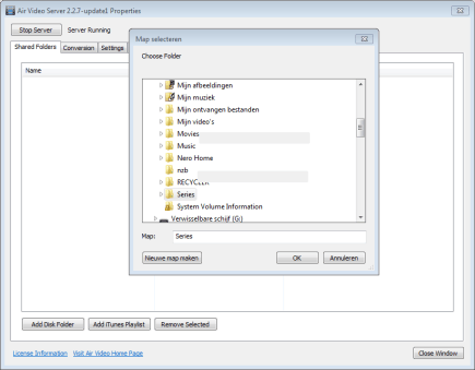 Het hoofdscherm van Air Video Server is nog helemaal leeg als u het voor de eerste keer start. Klik op Add Disk Folder en blader naar de map met video's die u op uw iPhone wilt bekijken. Klik daarna op OK. De map staat nu in het overzicht met Shared Folders. U kunt het scherm sluiten door rechtsonder op Close Window te klikken. Air Video Server blijft dan nog gewoon actief in uw systeemvak.