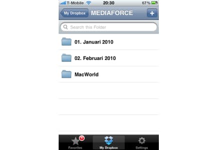 Het enige dat u nu nog nodig hebt, is de iPhone-app. In de App Store zoekt u op 'Dropbox', u installeert deze app en u kunt aan de slag. Start vervolgens de Dropbox-app en klik op I'm already a Dropbox user. Voer de inloggegevens in die u in de vorige stap hebt aangemaakt en klik hierna op Log in to Dropbox. U komt nu in een welkomstscherm. Klik linksboven op My Dropbox, waarna de bestanden of mappen die u in de vorige stap hebt toegevoegd verschijnen.