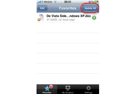 De bestanden en mappen bevinden zich niet echt op uw iPhone, maar op de Dropbox-server. Er is echter wel een mogelijkheid om de bestanden lokaal op uw iPhone op te slaan, namelijk door bestanden toe te voegen aan Favorieten. Open een bestand en klik onderaan op de ster. Het bestand is nu als favoriet gemarkeerd en u kunt het bestand sluiten (klik linksboven op het terug-knopje). Klik vervolgens linksonder op Favorites. Om het bestand daadwerkelijk lokaal op te slaan, klikt u rechtsboven op Update all. Op deze manier kunt u altijd bij uw bestanden, ook als u geen internetverbinding hebt. Helaas kunt u uw bestanden niet lokaal bewerken.