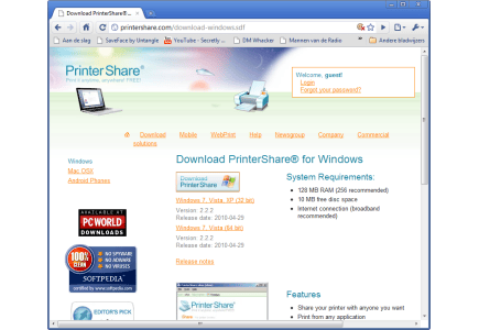 Standaard kunt u niet printen vanaf de iPhone, maar ook daar zijn weer diverse apps voor te vinden, zoals PrinterShare. Download eerst de software voor Windows via http://printershare.com/download-windows.sdf en installeer hem. Start het programma en klik op Create new account. Vul uw e-mailadres in en klik op OK. U krijgt nu uw login-informatie toegestuurd. Klik op OK, waarna u de op uw computer aangesloten printers ziet staan. Selecteer uw printer en klik op de knop Share. Nu kunt u het scherm minimaliseren.