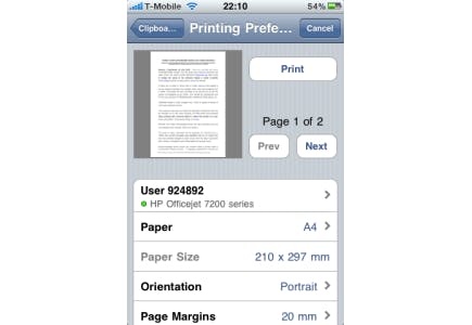 Nu gaan we weer de App Store in. Zoek op 'PrinterShare' en download de gratis app printerShare Mobile. Start PrinterShare vervolgens op en klik op New User om een account aan te maken. Nu komt u in het overzichtscherm waarin u kunt selecteren wat u wilt printen. U kunt foto's, contacten en web¬pagina's printen. Wilt u tekst afdrukken? Dan selecteert u simpelweg vanuit eender welke app de tekst en start u PrinterShare. Kies de optie Paste to print en klik vervolgens op de knop Print. U kunt nu nog instellingen wijzigen, zoals het papierformaat of de marges. Ook ziet u nog een kleine voorbeeldweergave. Staat alles naar wens ingesteld? Dan klikt u op Print, waarna de opdracht wordt verzonden. Het printen start nu niet direct, daar is nog een extra stap voor nodig.