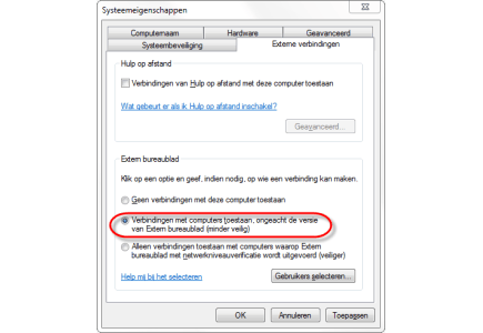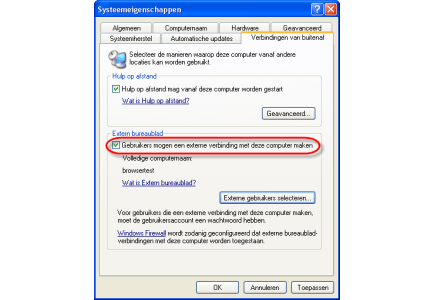 Hebt u Windows XP Professional, dan gaat u naar Start, Configuratiescherm, Systeem. Klik op het tabblad Verbindingen van buitenaf, plaats een vinkje voor Gebruikers mogen een externe verbinding met deze computer maken en klik op OK. Zorg ervoor dat uw gebruikersaccount is voorzien van een wachtwoord! Is dit niet het geval, corrigeer dit dan onder Start, Configuratiescherm, Gebruikersaccounts.