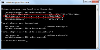 Open op uw pc een zogeheten command prompt (druk hiervoor tegelijk op de Windowstoets+R, voer cmd in en druk op Enter), en typ vervolgens ipconfig in. Achter IP-adres (Windows XP) of IPv4-adres (Windows Vista/7) ziet u uw uw lokale ip-adres. Dit ip-adres start in de meeste gevallen met 192.168 (bijvoorbeeld 192.168.1.2). In sommige gevallen kan uw ip-adres met 10. beginnen (bijvoorbeeld 10.0.1.2). Noteer dit ip-adres, dit hebt u nodig om Remote Desktop Lite te kunnen gebruiken.