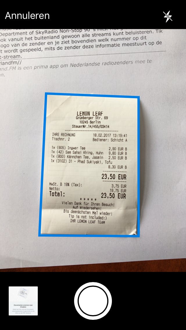 Tik op Document scannen en kies voor Nu proberen. Geef Dropbox toegang tot je camera en je foto's als je dat nog niet had gedaan door op OK te tikken. Dropbox probeert automatisch het document te herkennen en plaatst er een blauwe rand omheen. Als het je document goed heeft herkend, dan tik je op de camera-knop en wordt de foto meteen goed afgesneden.