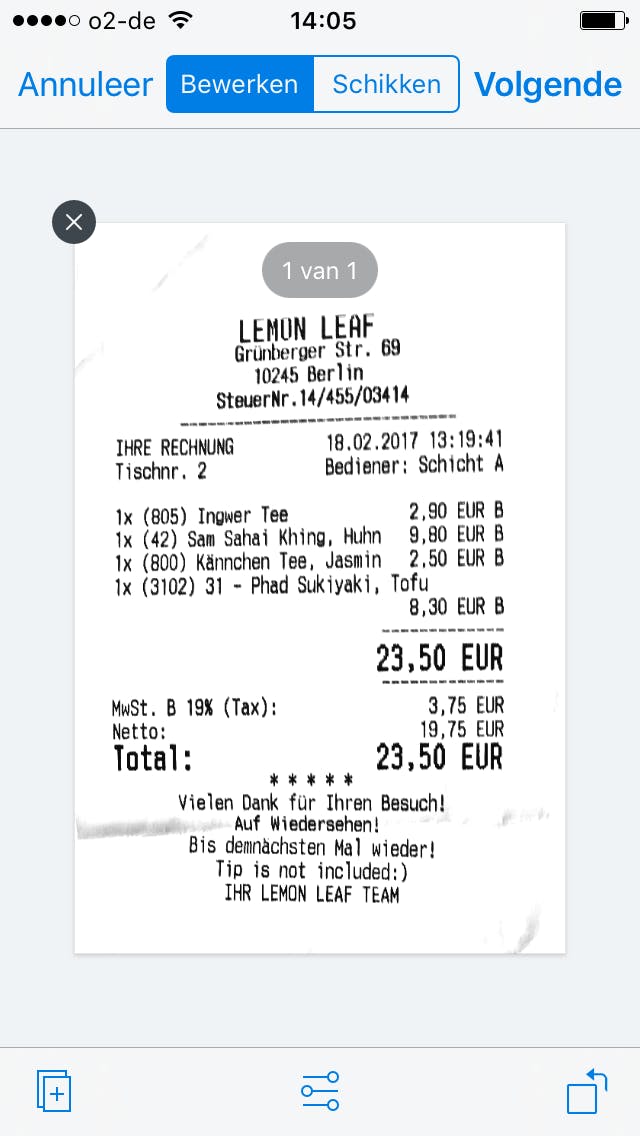 Tik op Volgende of verander de kleuren door op het bewerk-icoontje onderin te tikken. Achter Bestandsnaam vul je een naam in en achter Bestandstype kies je uit PDF of PNG. Standaard selecteert Dropbox de map van waaruit je op het plusje drukte. Wil je een andere map, tik dan op Kies een andere map en kies voor Locatie instellen. Sluit af door op Bewaar te tikken.