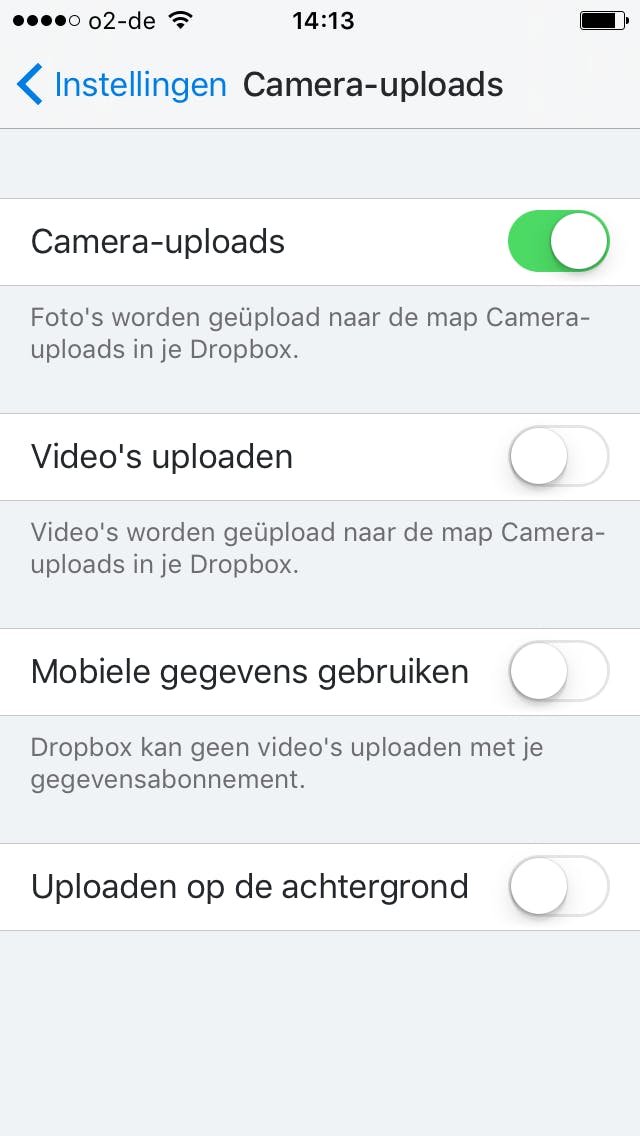 Als je de app voor iOS hebt gedownload, log je in met je accountgegevens. Dropbox vraagt je of je de functie Camera Uploads wilt inschakelen. We gaan hier straks even op in, je kunt dit ook vanuit de instellingen later nog activeren.