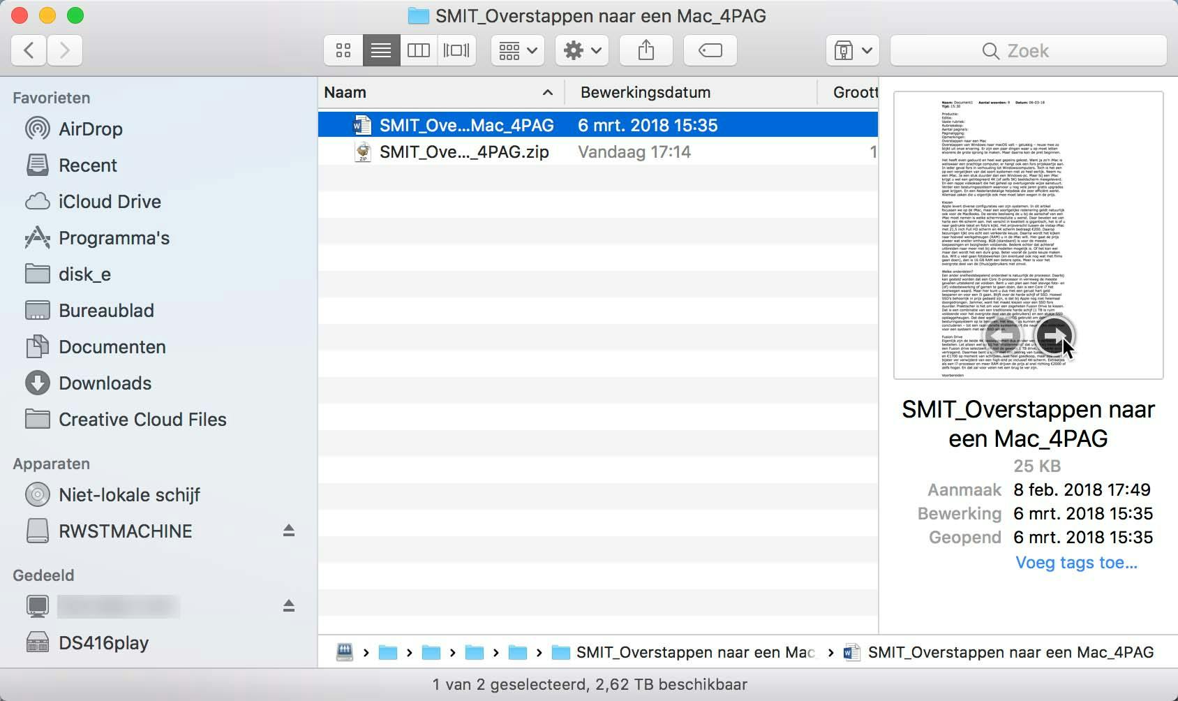 Heel aardig is Voorvertoning aanzetten. Als je nu op een ondersteund bestandstype klikt, zie je een preview zonder het bestand daadwerkelijk te openen. Dat werkt bijvoorbeeld bij Worddocumenten. Het is dan - om de zaak leesbaar te krijgen - wel handig het Finder-venster groter te slepen. ook de scheidingslijn aan de linkerkant van de preview kan meer naar rechts geschoven worden. Wil je nóg meer opties als het gaat om de weergave in Finder, dan klik je - nog altijd in het menu Weergave op Toon weergaveopties. Je kan nu extra kolommen inschakelen, de sorteervolgorde aanpassen, net als de lettergrootte en meer.