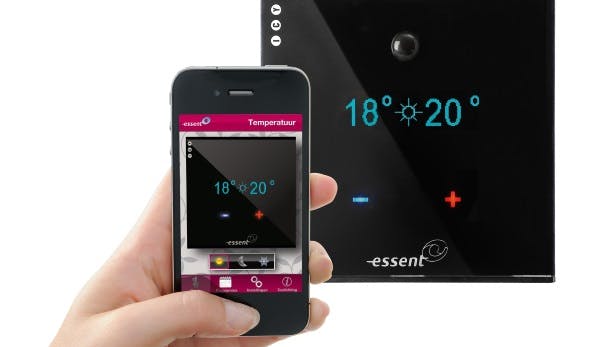 Via de E-thermostaat zelf kun je de temperatuur hoger of lager zetten en zie je de huidige en de gewenste temperatuur. De app is beschikbaar voor iOS en Android, tevens is de thermostaat via een website te bedienen. Via zowel de apps als de website kun je de thermostaat bedienen en programmeren. Lastig is dat een opdracht via de app soms pas na een paar minuten wordt doorgevoerd op de thermostaat. Essent richt zich sterk op energiebesparing. Een sensor houdt in de gaten of je aanwezig bent. De temperatuur wordt verlaagd als er enige tijd geen beweging wordt waargenomen. Je kunt de wachttijd zo ruim instellen dat je er in de praktijk geen last van zult hebben.