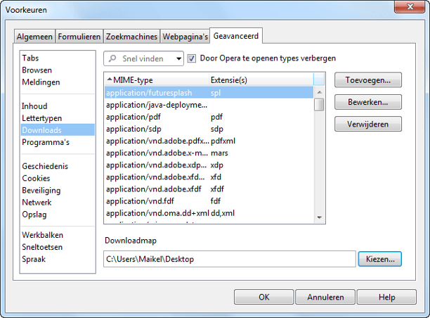 U kiest zelf de opslaglocatie voor uw gedownloade bestanden. Open het menu door rechtsboven op Opera te klikken. Vervolgens gaat u naar Instellingen / Voorkeuren. Klik op het tabblad Geavanceerd en kies aan de linkerkant voor Downloads. Onder Downloadmap gebruikt u de knop Kiezen, waarna u de gewenste map selecteert. Bevestig tot slot tweemaal met OK.