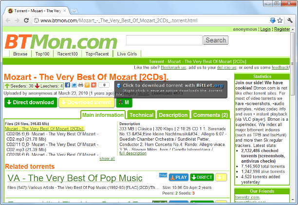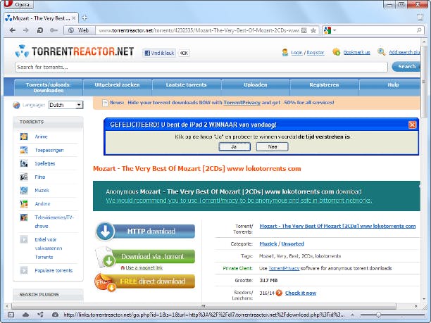 U opent de bittorrent-functie van Opera door op een torrent van een film of muziekalbum te klikken. Die zijn op verschillende websites te vinden. Surf bijvoorbeeld maar eens naar TorrentReactor.net en snuffel via de verschillende rubrieken door het aanbod. Hebt u specifieke wensen, dan kunt u natuurlijk ook de zoekfunctie gebruiken. Zorg er dan wel voor dat u bij Torrentreactor search results kijkt, want anders komt u op websites van adverteerders terecht. Kies altijd een torrent met veel seeders, zodat u de bestanden snel kunt downloaden. Seeders zijn computers die films en muziek delen via het bittorrent-netwerk, waardoor deze entertainmentbestanden beschikbaar zijn voor anderen. Klik op een titel om de informatie ervan te bekijken. Let onder meer op de bestandsgrootte, het formaat en de omschrijving.