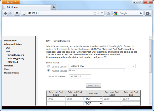 U weet nu welke netwerkpoort Opera gebruikt voor bittorrent-verkeer. Ook het IP-adres van uw computer is bekend. Pak de handleiding van uw router erbij om te achterhalen hoe u die achterhaalt. Bij ieder model gaat dat namelijk op een andere manier. U logt in op de beheerpagina door in uw browser het IP-adres van de router te typen, bijvoorbeeld http://192.168.1.1. Meestal dient u een gebruikersnaam en wachtwoord in te vullen. Deze gegevens vindt u veelal terug in de handleiding. Zoek op de beheerpagina naar het juiste onderdeel. Routerfabrikanten gebruiken hiervoor verschillende menunamen, zoals Virtual Servers of (Port) Forwarding. Zodra u het betreffende onderdeel hebt gevonden, dient u het goede IP-adres en poortnummer op te geven. Kies daarnaast voor het TCP-protocol. Zorg ervoor dat u de wijzigingen opslaat. Bent u de handleiding kwijtgeraakt? Surf dan naar PortForward.com. Hier zijn Engelstalige stappenplannen voor de meeste routers te vinden. Kijk of het goede model erbij staat en voer nauwkeurig de instructies uit.