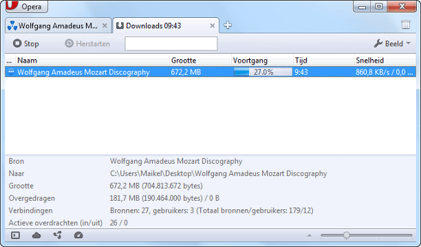 Als u alles goed hebt ingesteld, kunt u beginnen met downloaden. Klik op Openen, waarna u eventueel een andere downloadlocatie selecteert. Bevestig met Ja. Er wordt een nieuw tabblad geopend waarop het het downloadproces zichtbaar is. Hier controleert u hoe lang het nog duurt voordat de bestanden op uw computer staan. Daarnaast bekijkt u ook de downloadsnelheid en de totale bestandsomvang. Via Stop pauzeert u zo nodig het downloadproces. Wel zo prettig wanneer u de bandbreedte tijdelijk ergens anders voor wilt gebruiken. U mag zoveel downloadtaken toevoegen als u wilt. Als de film of het muziekalbum volledig op uw pc staat, verschijnt hiervan rechtsonder een melding.