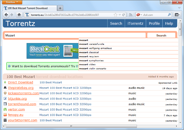 Naast TorrentReactor.net bestaan er nog veel meer torrentwebsites waarop u leuke muziek en films kunt vinden. Open de website Torrentz.eu maar eens in uw browser. Deze zoekmachine raadpleegt verschillende online bronnen, zoals The Pirate Bay, ExtraTorrent en btjunkie. De kans is hierdoor groter dat u die lang gezochte thriller of dat jazz-album eindelijk te pakken krijgt. Typ in het zoekveld bijvoorbeeld de naam van een cd of dvd die u graag wilt hebben en klik op Search. Staat er iets voor u tussen? Klik dan op de titel. Meestal hebt u keuze uit meerdere websites waarvan u het torrentbestand kunt ophalen. U gebruikt de browser Opera om de data direct te downloaden.
