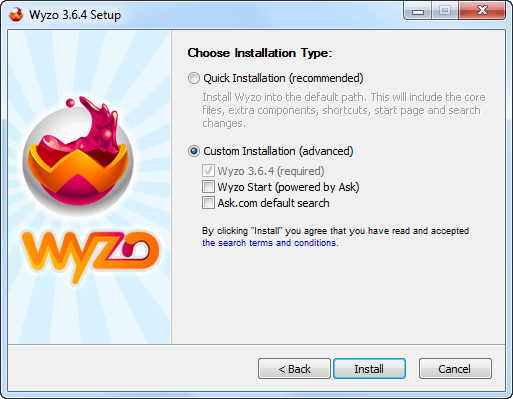 Wyzo is grotendeels gebaseerd op Firefox en heeft het voordeel dat er een fraaie bittorrent-functie binnen de browser is gehuisvest. Ga naar Wyzo.com en klik op Download Wyzo 3. Kies op de volgende webpagina voor Wyzo for Windows en voer het exe-bestand uit. Overigens kunt u Wyzo ook voor Mac OS X gebruiken. Klik op Next en accepteer met I Agree de licentievoorwaarden. Selecteer de optie Custom Installation (advanced). Verwijder de vinkjes voor Wyzo Start (powered by Ask) en Ask.com default search. Door achtereenvolgens op Install / Next / Finish te klikken, installeert u het programma op de computer. Zodra Wyzo voor de eerste keer opent, kunt u optioneel gegevens uit andere browsers importeren. Denk bijvoorbeeld aan instellingen, surfgeschiedenis, favorieten en wachtwoorden. Maak een keuze, waarna de browser zich opent.
