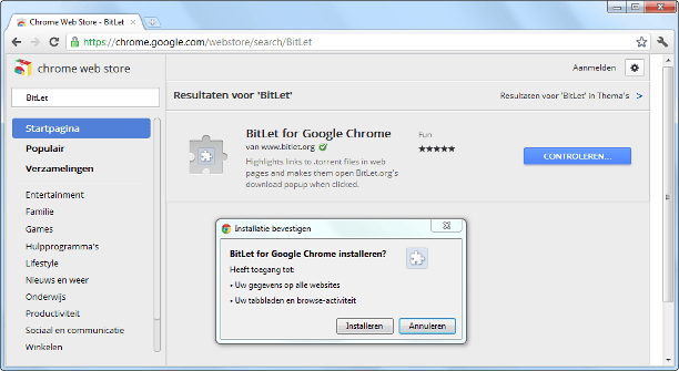 Met een speciale uitbreiding voor Chrome voegt u nog sneller torrents aan BitLet toe. Als deze browser nog niet op uw pc staat, kunt u hem downloaden vanaf Google. U opent de galerij met plug-ins door naar Chrome Webstore te surfen. Linksboven bevindt zich het zoekvak Winkel doorzoeken. Typ hier BitLet en druk vervolgens op de Enter-toets. De uitbreiding BitLet for Google Chrome wordt als enige resultaat gevonden. Klik op de blauwe knop TOEV. AAN CHROME. Bevestig met Installeren. Er verschijnt nu een melding dat de uitbreiding is geïnstalleerd.