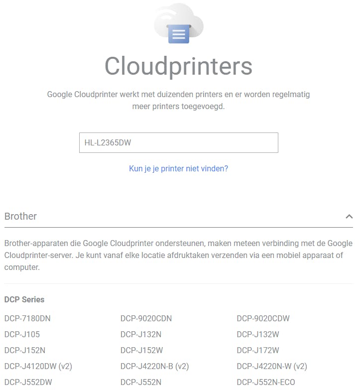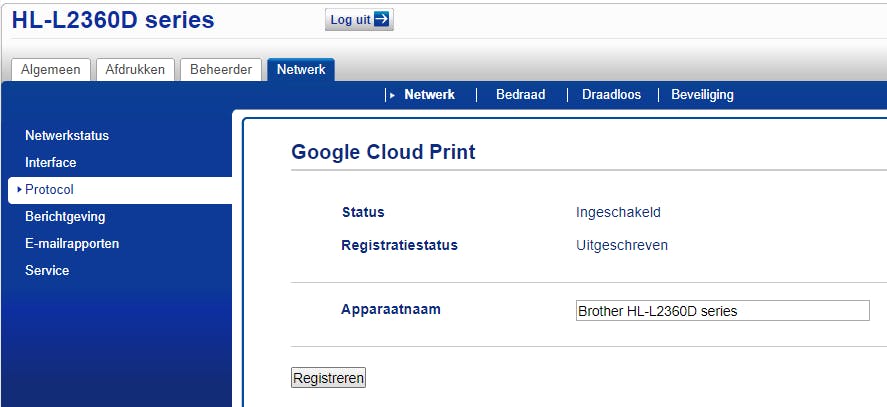 Heb je een Cloudprinter versie 1.0, volg dan de instructies van je printerfabrikant om je printer te registreren. Dat gaat doorgaans via de webinterface van je printer met behulp van een wizard. Een voorbeeldje: bij onze Brother HL-L2365DW ging het via de rubriek Protocol / Google Cloud Print / Geavanceerde instellingen.