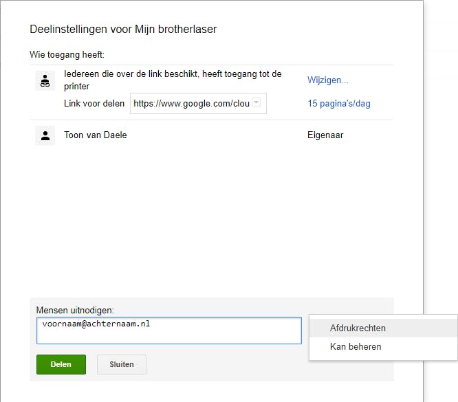 In het menu tref je ook de optie Delen aan. Daarmee kun je toelaten dat ook anderen op jouw printer(s) afdrukken. Standaard staat een printer ingesteld op Privé, maar via Wijzigen valt dat aan te passen in Iedereen die over de link beschikt, heeft toegang tot de printer. Achter Link voor delen krijg je een link te zien. Je kunt gelukkig instellen hoeveel pagina’s er dagelijks mogen worden geprint. Het is tevens mogelijk om alleen bepaalde gebruikers toegang te geven. Voer de namen of e-mailadressen van die personen in bij Mensen uitnodigen. Via de knop Afdrukrechten leg je ten slotte vast of die personen medebeheerder van je printer zijn dan wel of ze alleen mogen afdrukken.