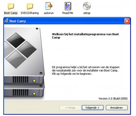 Na de installatie van Windows, start de installatie-dvd van Mac OSX in Windows. Boot Camp installeert vervolgens alle benodigde drivers en software.