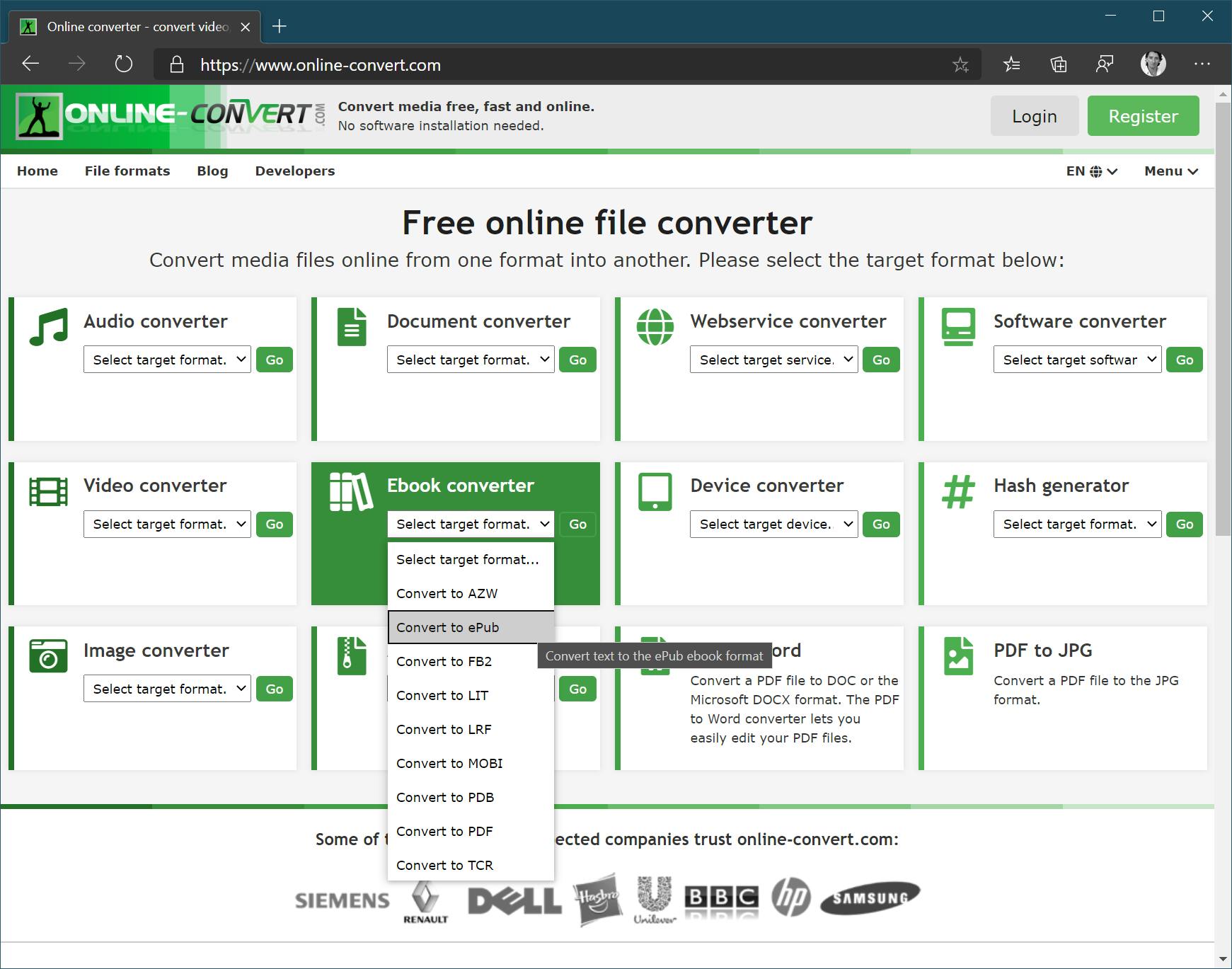 In Word kun je je boek helaas niet direct opslaan in het epub-formaat. We schakelen daarom de hulp in van een externe dienst, namelijk online-convert.com.