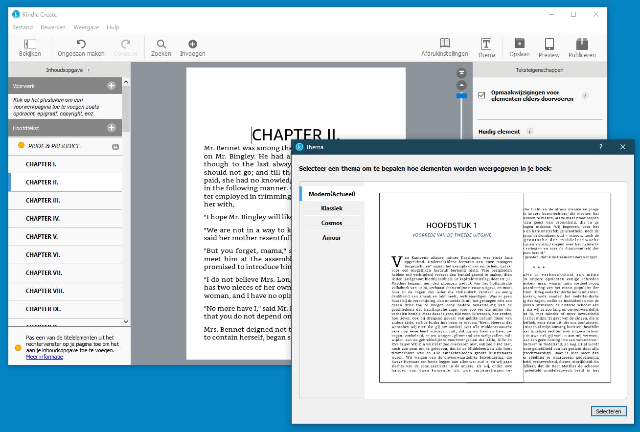 Wil je je e-book verspreiden via Amazon, dan kunt u ook gebruikmaken van een Kindle Create. Met dit gratis programma kun je je e-book op een nette manier opmaken. Na de installatie klik je op Nieuw project uit bestand. Links geef je aan welk type boek je wilt maken. Klik op beide opties en bekijk in het rechtervenster welke kenmerken bij het soort boek horen.