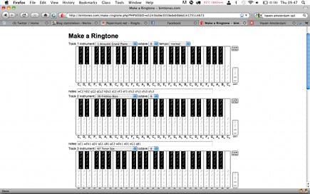 Wanneer u wat meer muziekkennis hebt en ook noten kunt lezen, is de Big Keyboard-modus van Bimtones.com wellicht beter geschikt voor u. In deze modus, die u in het midden van het scherm onder het klavier selecteert, beschikt u over zes verschillende pianoklavieren waarop u uw melodieën kunt inspelen. Een belangrijker verschil met de Small Keyboard-modus is dat u op toetsen van dit keyboard de lengte van de noten kunt aangeven. Zo kunt u hele en halve noten aanbrengen, en zelfs achtste of zestiende nootjes inspelen in uw compositie. Een andere extra optie is dat u van alle instrumenten apart de melodielijnen kunt inspelen. Met de tot uw beschikking staande instrumenten - en dat zijn er veel meer dan in de Small Keyboard-modus - kunt u heel eenvoudig een rock- of jazzbandje laten klinken. Daarvoor selecteert u dan bijvoorbeeld de vleugel, een contrabas en de verschillende onderdelen van een drumstel. Door tot slot nog een saxofonist toe te voegen, wekt u een heel aardig jazzkwartet tot leven! Als uw creatieve werk gereed is, klikt u helemaal onderaan de pagina op Make My Ringtone, waarna u het bestand kunt opslaan.