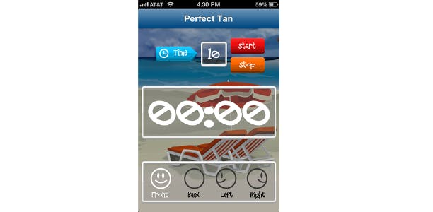 Het is een eenvoudige app met een gebruiksvriendelijke interface. Het startscherm biedt een aantal opties. Je vult in het timerveld in hoe lang je wilt bruinen, en drukt op de rode Start-knop. Perfect Tan begint met aftellen, en piept wanneer je je om moet draaien. Het begint dan automatisch de aftelling voor de volgende kant (standaard begint de app met de voorkant, en vervolgens de achterkant, links, en rechts), dus als je even een pauze neemt om het water in te gaan of een ijsje te halen, zorg dan dat je eerst op de oranje Stop-knop drukt.