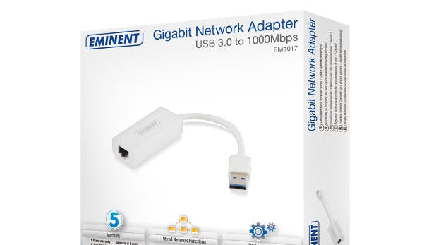 Sommige notebooks zoals Apples meeste recente MacBooks zijn zo dun dat er geen ruimte is voor een netwerkaansluiting. Wil je toch aan de slag met een gigabitnetwerkverbinding en heeft je notebook een usb3.0-poort, dan kun je gebruik maken van Eminents EM1017 USB 3.0 Gigabit Netwerkadapter.