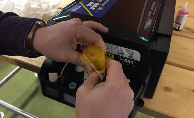 Bij de vorige variant van de EcoTank was het inktreservoir duidelijk aan een bestaande printer vastgemaakt. Bij de nieuwe lijn EcoTank-printers is dat een stuk fraaier opgelost en is het inktreservoir een naadloos onderdeel van de behuizing. Je krijgt bij de printer de inkt meegeleverd in vier flesjes van 70 ml. Om de printer in gebruik te nemen moet je de vier flesjes voorbereiden door een dopje af te breken en een folie te verwijderen. Vervolgens open je vier vulopeningen en giet je de inhoud van de flesjes in de juiste vulopening. Het klusje is goed te doen, maar helemaal schoon waren mijn handen niet. Na het vullen zie je op de zijkant via een raampje dat de inktreservoirs vol zijn. Vervolgens moet je de printer aanzetten waarna het twintig minuten duurt om de inkt door de rest van het systeem te pompen.