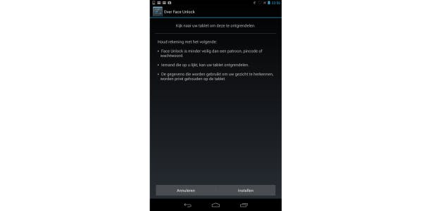 Dat is geen onrealistische angst voor een nieuwe technologie, Android zelf waarschuwt voor dit zwaktepunt wanneer je Face Unlock inschakelt. Oftewel, als je écht belangrijke gegevens op je smartphone of tablet bewaart, dan is een gewoon wachtwoord wellicht slimmer. Is dat niet het geval, dan is Face Unlock natuurlijk heerlijk futuristisch en cool om te gebruiken.