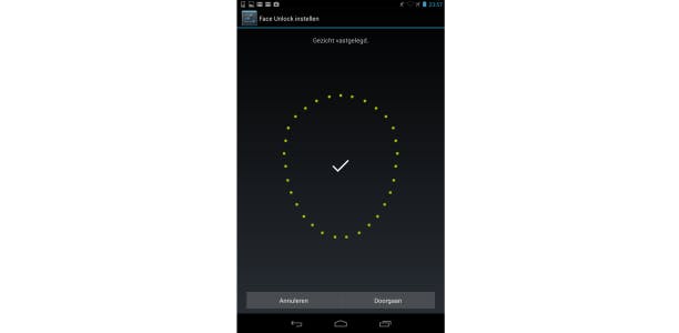 Vervolgens zie je een silhouet waarin je je gezicht moet plaatsen. Houd je smartphone of tablet zo dat je gezicht binnen die contouren valt. Doe je dit lang genoeg, dan zal het silhouet groen kleuren en is je gezicht vastgelegd. Druk op Doorgaan. Vervolgens krijg je de vraag wat je als secundaire beveiliging wilt in geval Face Unlock niet werkt (bijvoorbeeld omdat het te donker is). Maak een keuze en stel je secundaire wachtwoord in. Face Unlock is nu ingesteld.