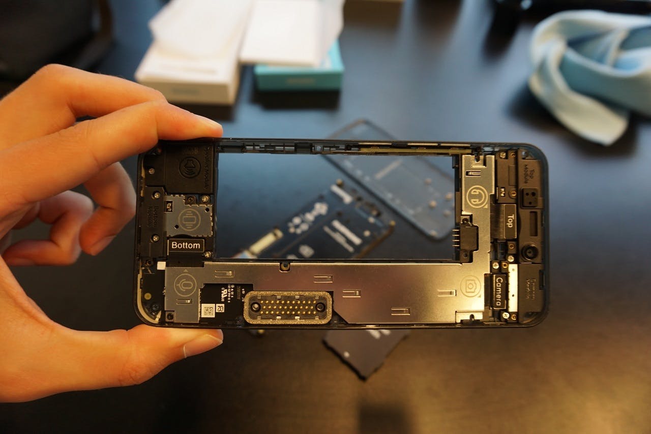 Nu kan je onderdelen vervangen, al spreekt Fairphone liever over modules. Het scherm is zo'n module, net als de luidspreker, de camera achterop, de usb-c-aansluiting, de selfiecamera met 3,5mm-poort en het pcb (de printplaat). Om deze modules te verwijderen, gebruik je opnieuw de schroevendraaier en moet je de connectoren loskoppelen. Dat laatste kan volgens Fairphone met je vingers, maar vlot ging dat niet. Het was prettig geweest als er in de doos een hulpstukje zat om dit klusje sneller en comfortabeler te klaren. In zijn algemeenheid werkt het concept wel heel aardig en kun je binnen een kwartier het scherm of een andere module vervangen.