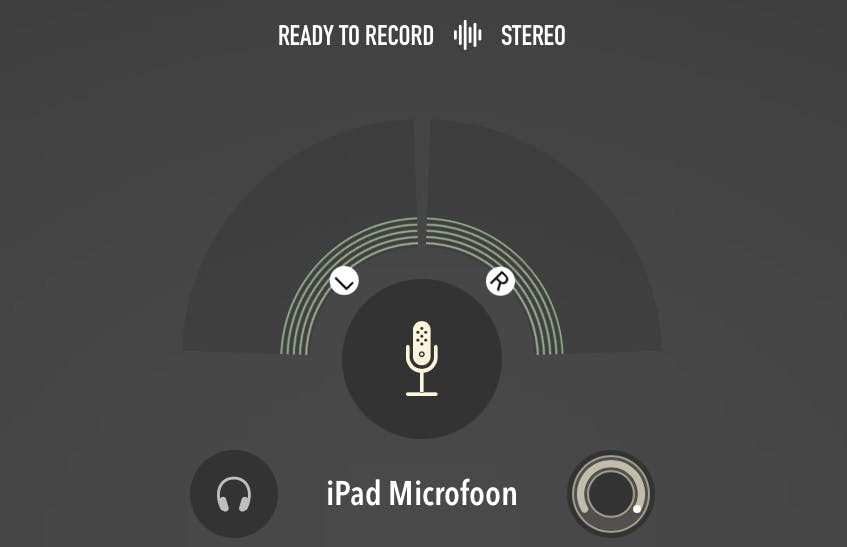 In dit voorbeeld gaan we simpelweg aan de slag met de in een iPad ingebouwde microfoons, om even een snelle indruk van de mogelijkheden te geven. Voordeeltje daarvan: je kunt nu stereo-opnamen maken. Centrale spil is de opname-volumeregelaar in de vorm van een cirkeltje. Dat vind je rechtsonder het centraal geplaatste microfoonknopje.