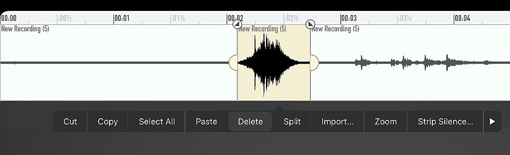 Wil je een fragment in een opname verwijderen, dan splits je op het begin- en eindpunt van het ongewenste deel. Tik dan op het geïsoleerde blokje en dan in het verschenen menu op Delete. Aansluitend verwijder je desgewenst het nu ontstane ‘gat’ door op Ripple Delete te tikken. Of je sleept de overgebleven blokken naar een andere positie.