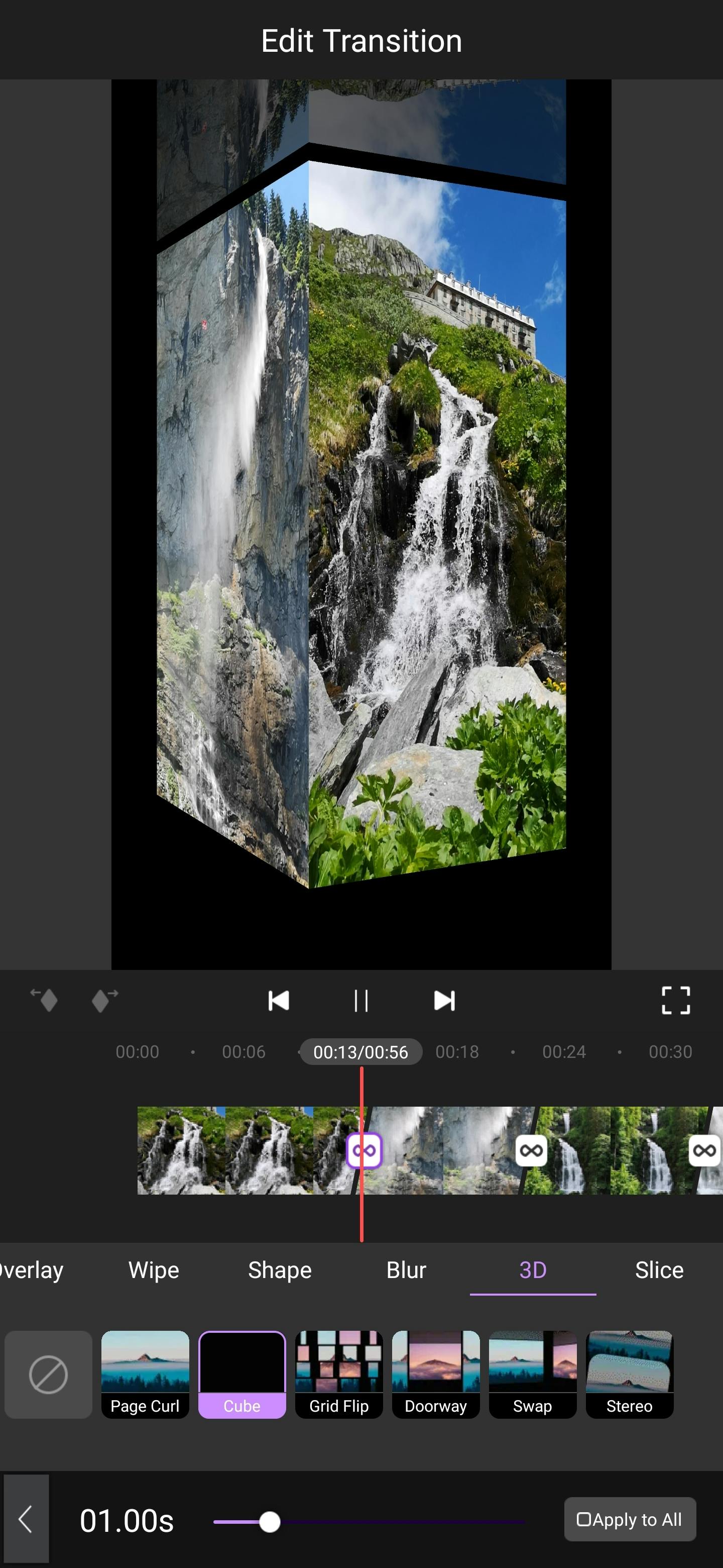 Standaard gaan filmclips nogal abrupt in elkaar over en daar is op zich niets mis mee. Wil je dit liever vloeiend laten verlopen, tik dan op het plusteken tussen twee filmpjes en stel een van de vele fraaie overgangseffecten in. Tik eventueel rechts onderin op Apply to All om het gekozen overgangseffect op alle filmpjes in de montage toe te passen.