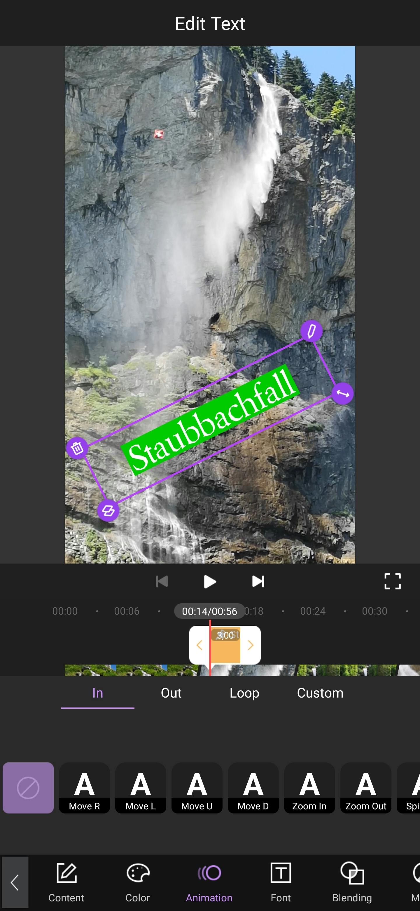 Al met al kun je de animatie zo subtiel of extreem maken als je zelf wilt. Standaard verschijnt je tekst of een sticker midden in het beeld. Je mag het zelf naar de gewenste plek slepen. De grootte stel je in door met twee vingers te knijpen. Door je vingers te draaien, kun je de tekst schuin zetten.
