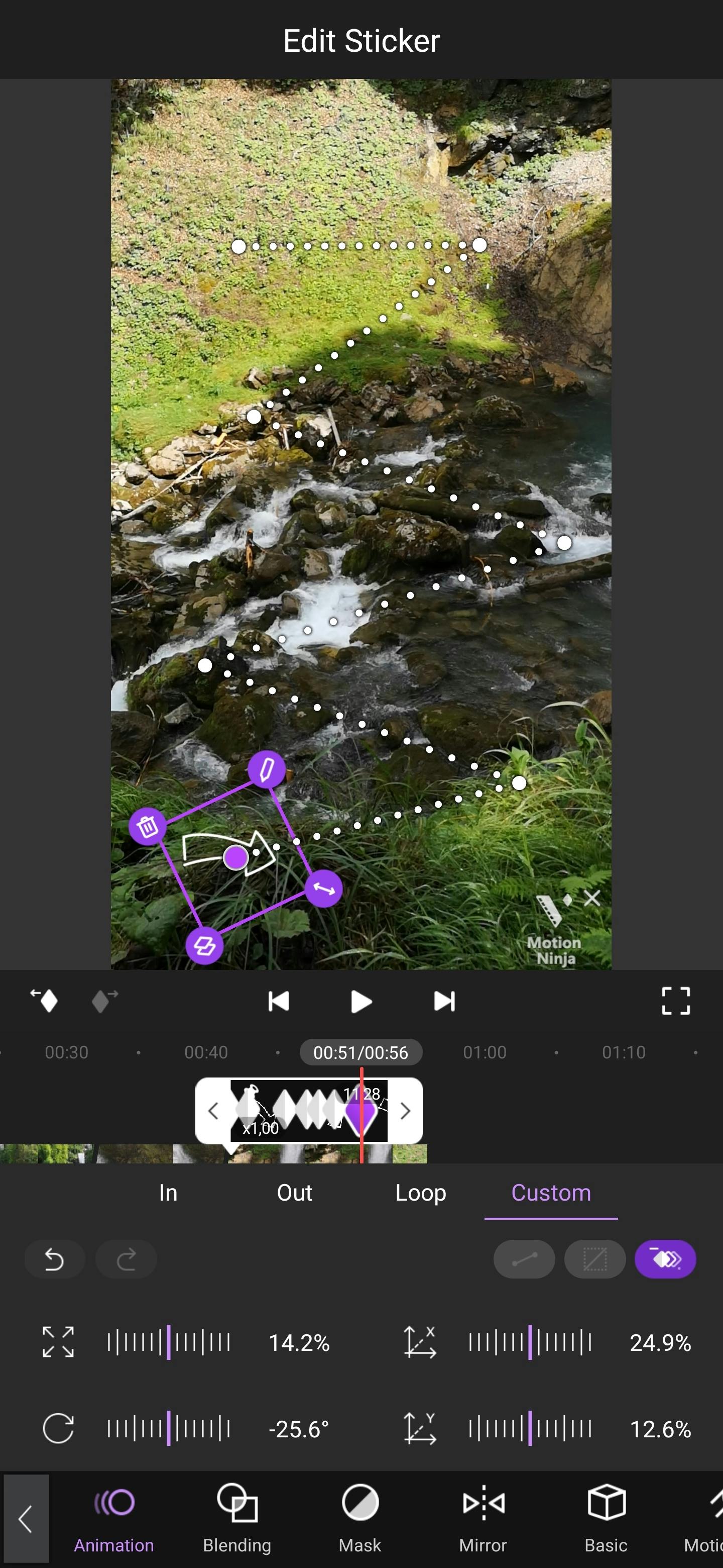 Het bijzondere aan Motion Ninja is dat je ook zelfbedachte animaties aan teksten en stickers kunt toevoegen. Je zit dus niet vast aan de ingebakken bewegingen van daarnet. Een eigen animatie maken is bijzonder eenvoudig, waardoor je in een oogwenk de leukste en professioneel ogende filmpjes in elkaar draait.