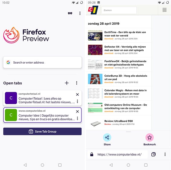 Een van de opvallendste aanpassingen is dat de adresbalk van bovenaan het scherm naar onderen is verplaatst. Wat eigenlijk een veel logischere plek is, waar je met één hand beter bij kunt. Openstaande websites worden in overzichtelijke 'tabgroepen' opgeslagen, die eventueel te delen zijn met andere Fenix-gebruikers.