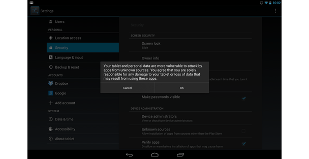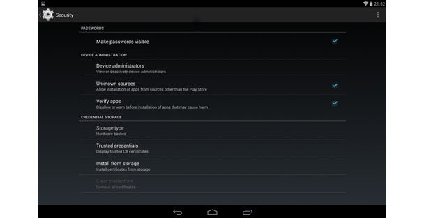 De eerste stap voor het toevoegen van Flash aan Android KitKat is het Settings menu te openen, omlaag te scrollen naar Security, en het vakje aan te vinken om het installeren van apps van onbekende herkomst toe te staan. Vergeet niet om dit weer uit te schakelen nadat je onze handleiding gevolgd hebt.