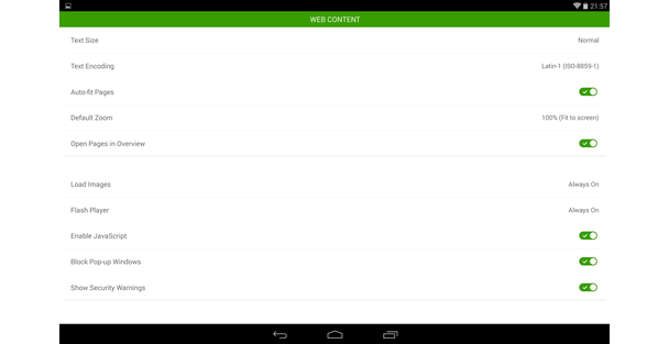 Om Flash playback in Android KitKat in te schakelen heb je de Dolphin browser nodig - gratis verkrijgbaar via Google Play. Als deze eenmaal gedownload en geïnstalleerd is, open het Settings menu van de browser, zorg ervoor dat Dolphin Jetpack is ingeschakeld, scrol omlaag en selecteer Web Content. Zoek in het volgende venster naar Flash Player en zorg dat deze is ingesteld als Always On.
