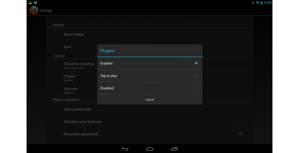 Stap 4. Vervolgens heb je een browser nodig die de Flash Player plug-in kan ondersteunen, zoals Mozilla Firefox. Download Firefox via Google Play en open de browser. Druk op de drie horizontale strepen aan de rechterbovenkant van het venster van de browser en kies Settings. Onder Content, kies Plugins. Voor een naadloze Flash ervaring raden we aan om de Enabled optie te selecteren in plaats van de Tap to play optie.