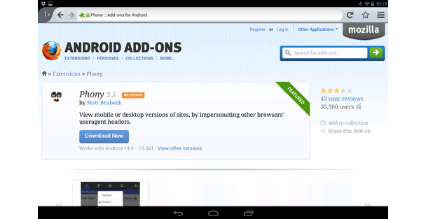 Phony is een gratis Firefox add-on die websites laat geloven dat je een desktop browser gebruikt. Je kunt de add-ons van Firefox benaderen vanaf het thuisscherm van de browser, of je kunt Add-ons kiezen in het menu rechts bovenaan het scherm en op het boodschappenmandje drukken. Als je Phony geïnstalleerd hebt, druk op het menu recht bovenaan, en kies Phony. Selecteer vervolgens Desktop Firefox als je User Agent en druk op OK.