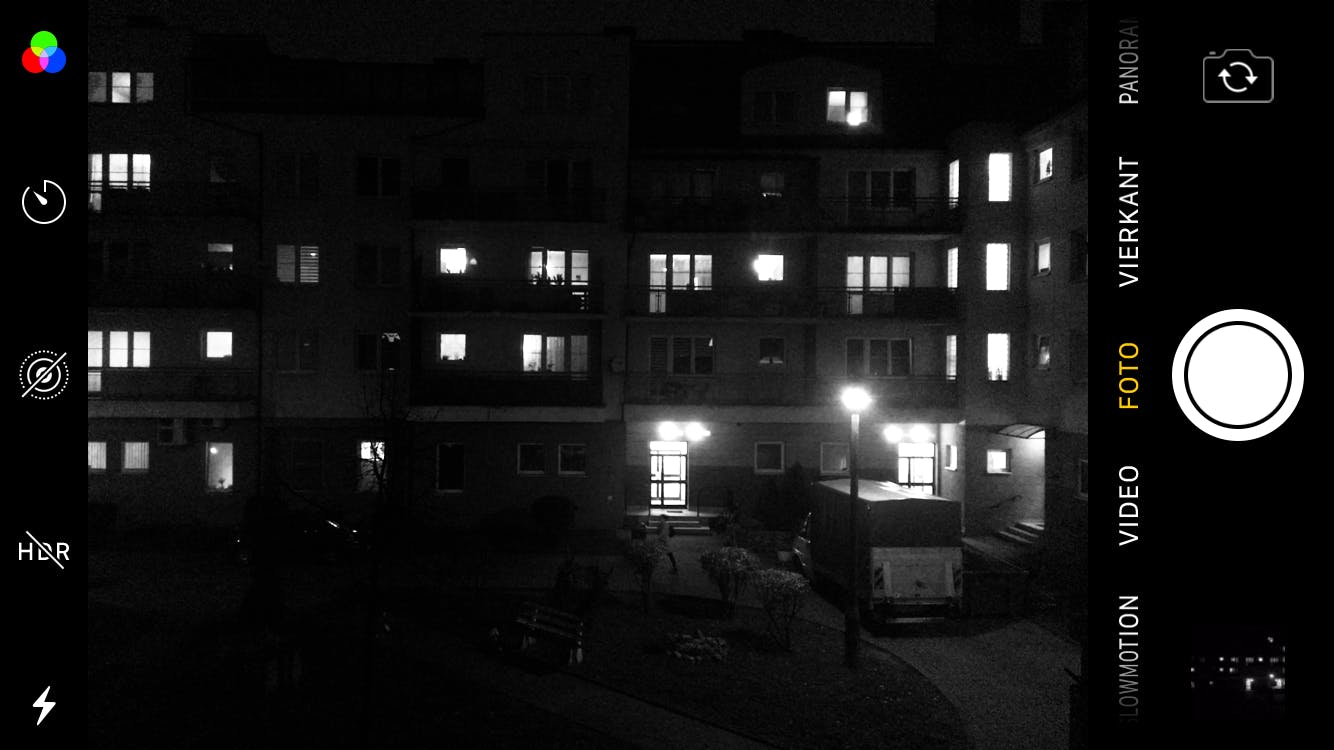 Mobiele fotografen zijn gek op filters, dat zien we elke dag weer op social media. Op de iPhone (en vreemd genoeg niet op de iPad) is er in het bovenstaande rijtje met knoppen nog eentje beschikbaar in de vorm van over elkaar heen liggende balletjes in grijstinten. Tik je daar op, dan kies je uit een hele serie live filters. De foto's worden opgeslagen zoals je ze in de zoeker ziet, ofwel: what you see is what you get. Het is wel een beetje een optie voor 'luie' fotografen die vooral hun kiekjes zo snel mogelijk willen delen met de rest van de wereld. Want het is beter om gewone, ongefilterde foto's te maken en de filtering pas achteraf toe te passen. De reden is logisch: een eenmaal naar bijvoorbeeld zwart-wit gefilterde foto weer terugbrengen naar de oorspronkelijke kleurenfoto is onmogelijk. Maar van een kleurenfoto een zwart-wit-foto maken is een eitje, ook in iOS. Overigens: als een filter actief is, is dat ook herkenbaar aan de 'bolletjesknop' die nu gekleurde bolletjes toont.