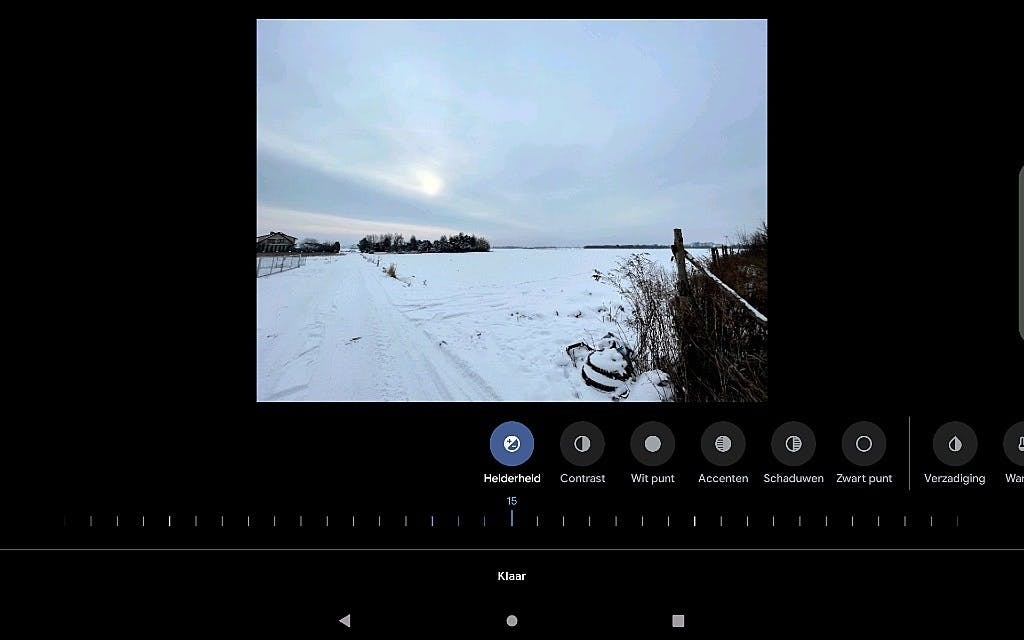 Je bent nu in de bewerkingsmodus van Foto’s aanbeland. Voor de meer lui aangelegde mensen volstaat – soms – een tik op de knop Verbeteren. Of maak een foto wat warmer of juist koeler gekleurd middels de daarvoor bestemde knoppen. Deze manier werkt lang niet altijd en veel betere resultaten zijn na een tik op Aanpassen haalbaar. Je krijgt nu een hele serie knoppen te zien met termen die een ieder die weleens met Lightroom gewerkt heeft bekend voorkomen. We kijken naar onze voorbeeldfoto. Die oogt wat weinig sprankelend, terwijl het winterlandschap zeker interessant is. Om te beginnen gaan we de helderheid middels de gelijknamige knop wat opschroeven. Je doet dat middels de schuifregelaar die verschijnt na een tik erop. Overdrijf niet, want dan raak je detail kwijt in de lichtste delen!