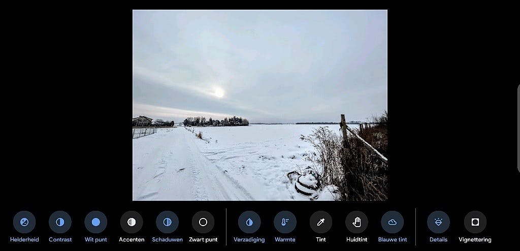 Heel erg ‘koude’ foto’s kun je verder ook nog wat meer kleur geven via de knop Verzadiging. Ook geschikt om strandfoto’s die bekende overdreven reisgidsen-uitstraling mee te geven. Ook met Warmte kun je een beetje spelen, al maak je daar een winterfoto vaak weer wat te warm mee naar onze smaak. De regelaar Details geeft meer structuur aan oppervlakken, wat ook onze winterfoto ten goede komt. Tevreden met het resultaat? Tik dan op Klaar.