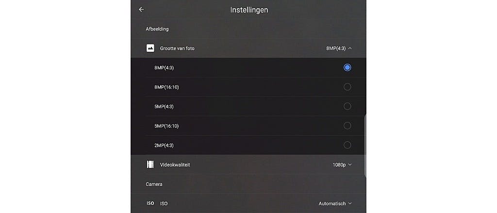 Om de mogelijkheden van jouw camera te bekijken, start je de app Camera. Tik vervolgens op het instellingentandwiel boven in beeld. Via het selectiemenu achter Grootte van foto zie je de voor jouw Android apparaat beschikbare resoluties. In dit voorbeeld betreft het een simpele tablet met een 8 Megapixel-camera. Wij kozen hier dus voor 8MP(4:3). Verder kun je allerlei andere zaken naar wens aanpassen. Zo kun je bijvoorbeeld met een schakelaar het sluitergeluid uitzetten. Handig voor als je onopvallend foto’s wilt maken bijvoorbeeld. Ook de aloude timer kan nog best van pas komen. Zeker als je eens een foto van jezelf wilt maken met de hoofdcamera van je toestel. Bij veel toestellen is dat namelijk de enige camera waar je echt fatsoenlijke foto’s mee kunt maken. Let wel op dat als jij je toestel op bijvoorbeeld een muurtje zet, een snelle gauwdief z’n kans niet pakt natuurlijk. Snapshotfotografen kunnen het best van meer geavanceerde instellingen afblijven, maar een ieder die net wat meer controle wil moet eens kijken naar opties als ISO, Witbalans, Belichting enzovoorts.