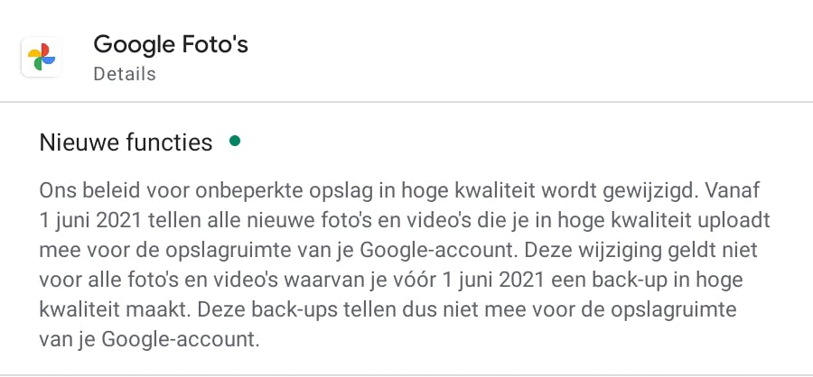 Nog een waarschuwing tot slot: Google laat je foto’s in hoge resolutie vanaf 1 juni dit jaar niet meer onbeperkt opslaan binnen je Google-account. Elke foto gaat qua opslagruimte af van de standaardopslagruimte binnen je account. Veel foto’s uploaden zorgt er dus voor dat die opslag snel vol zal lopen. Enige remedie is dan opslagruimte bij kopen. De plezierdagen van alles voor nop zijn duidelijk voorbij.