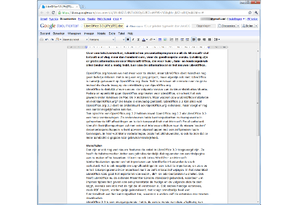 Wellicht bent u bekend met het gratis kantoorsoftwarepakket OpenOffice.org. Uit onvrede over de invloed die het bedrijf Oracle had op OpenOffice.org, is LibreOffice gestart: een nieuw opensource-pakket. Hiermee kunt u natuurlijk tekstverwerken, maar ook spreadsheets, presentaties, tekeningen, databases en rekenformules maken. Het uiterlijk van de programma's lijkt nog het meest op die van Office 2003, dus geen lint, maar losse uitvouwmenu's en functieknoppen waarmee snel de tekst opgemaakt kan worden. De mogelijkheden zijn behoorlijk uitgebreid, wat er echter aan ontbreekt is de mogelijkheid om online (samen) te werken. Gelukkig kunt u hiervoor Google Docs gebruiken, waar u eenvoudig uw (odt-)bestanden naar kunt uploaden.